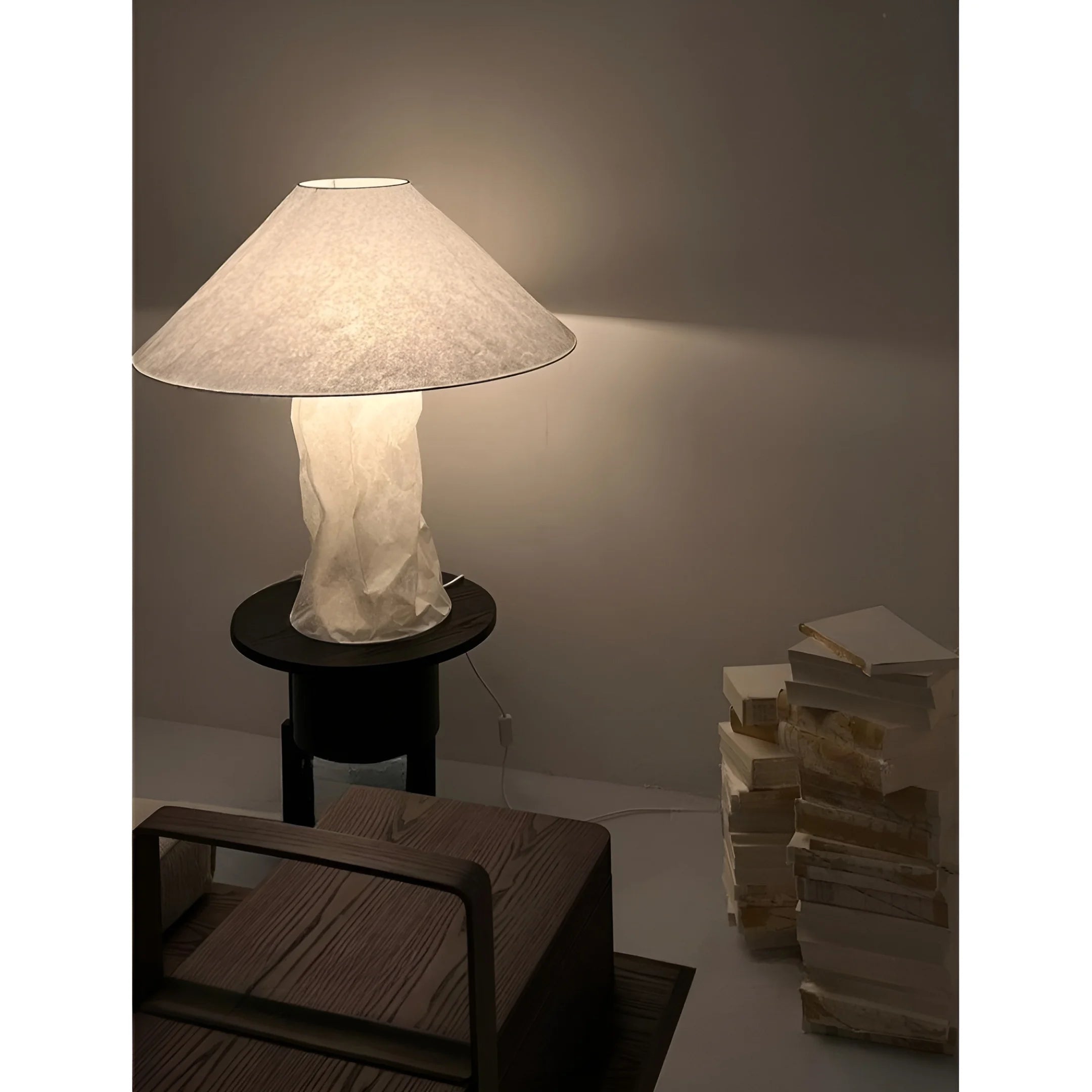 Japandi inspired paper table lamp with sculptural base placed near a window with books in a modern interior