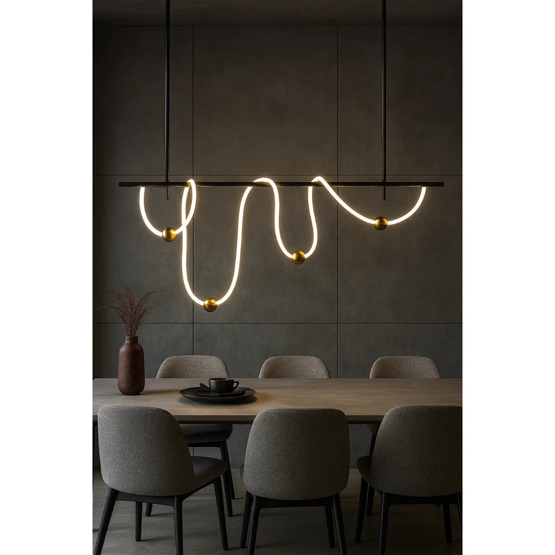 The Irregular Linear LED Pendant Light blends minimalist aesthetics with an artistic fluid form.